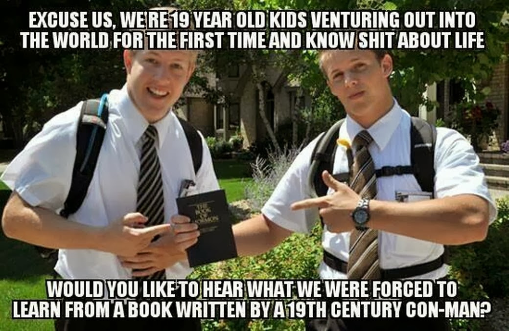 I didn’t serve a mission, so I can’t really comment on that part of things. I agree that the Tumblr post is a bit cynical, but it is an accurate reflection of how people see us, so it’s at least instructive. I also think the comments do have a point or two, especially about the naivete and unpreparedness of missionaries. And it’s also true that there are many members who indeed take both cruel insults and legitimate criticism of the church as signs that the church is, indeed the ONE TRUE CHURCH. I don’t want to open that can of worms about whether the church is a cult; we’ve done that here before, but I will say that that is one sign of at least cult-like behavior or brainwashing; treating facts that refute one’s beliefs as, bizarrely, further proof of said beliefs. THAT’s a tendency I’ve seen a lot of over the years. And surely there is something to the numbers of returned missionaries who later leave the church; perhaps the mission experience is not as seminal and testimony-strengthening as our leadership tells us it is. I’m happy to hear about those who really enjoyed and benefited from the mission experience. And I’m equally saddened to hear about those who did not find serving a mission a fulfilling experience. I think it really would benefit our young people if we just took our foot off the gas a bit when it comes to the whole necessity of serving a mission (especially, obviously, for the young men). Less pressure might mean fewer missionaries, but it might also mean more healthy young people.