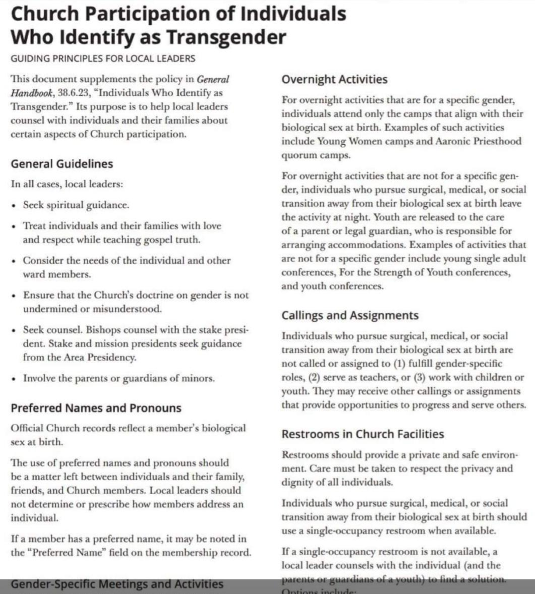The handbook section on “Individuals Who Identify as Transgender” (38.6.23) contains within it a link to “guiding principles” which is the document that is included as a screen shot (which doesn’t grab the entire document) in the OP. I don’t know why we have two layers of documentation here; I’m not aware of other instances of this, but I also don’t read the handbook for fun, so I might just be ignorant here. I’m tempted to speculate that the motivation is so that The Church can change the “guiding principles” at any time without it constituting a handbook update. As soon as I saw that the policy had been updated I took screen shots on my phone before it could download the update so I can compare.