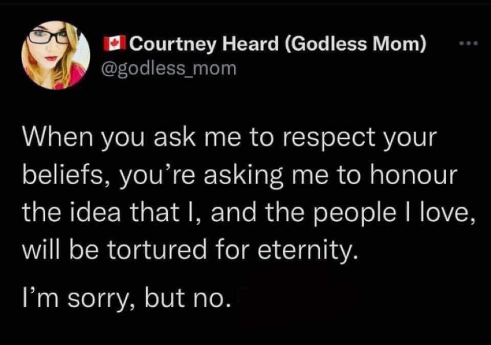 “When you ask me to respect your beliefs, you’re asking me to honour the idea that I, and the people I love will be tortured for eternity? I’m sorry, but no.”