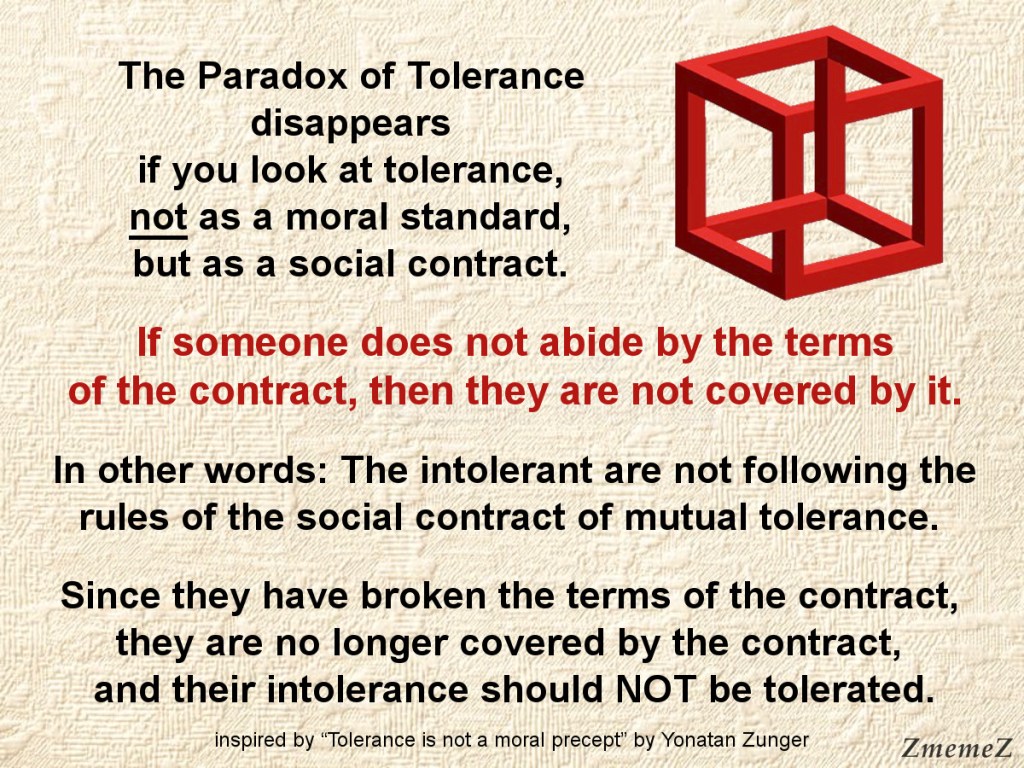Tolerance is a social norm because it allows different people to live side-by-side without being at each other’s throats. It means that we accept that people may be different from us, in their customs, in their behavior, in their dress, in their sex lives, and that if this doesn’t directly affect our lives, it is none of our business. But the model of a peace treaty differs from the model of a moral precept in one simple way: the protection of a peace treaty only extends to those willing to abide by its terms. It is an agreement to live in peace, not an agreement to be peaceful no matter the conduct of others. A peace treaty is not a suicide pact. [from “Tolerance Is Not A Moral Precept” by Molatan Zunger on Medium.]