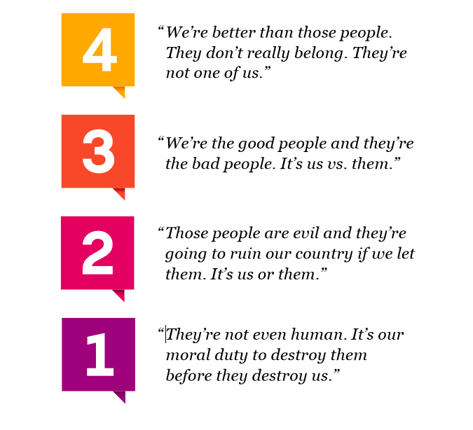 I would rate Wilcox’s talk around Level Four (“We’re better than those people. They don’t really belong. They don’t really share our values.”) with some ideas that stoop down to Level Three (“We’re the good people; they’re the bad people. It’s us versus them.” and “They look down on us and mock our values.”). Wilcox discussed an ‘us vs. them’ situation, while clearly trying to be nice about it. Divisive language sounds a lot like Wilcox when the speaker is trying to be super polite about relating us versus them ideas.