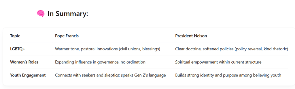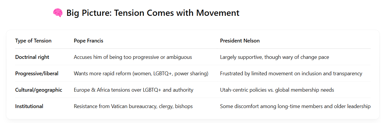 Conservative pushback. Pope Francis was seen as watering down doctrine, pushing LGBTQ acceptance that some African bishops rejected, decentralizing too much, and creating instability. Some cardinals questioned his fidelity to core church teachings, claiming he was making the Church too worldly. President Nelson’s rapid institutional changes made some longtime church members unsettled by shortening church, rebranding the “Mormon” identity, ending home/visiting teaching, and overall disinvesting in the social aspects of church.