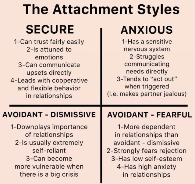 With my parents, I can see elements of all three of these styles, but probably avoidant-dismissive fits best. My parents were in their 40s when I was born, and they mostly did their own thing while I did my own thing. When it came to the church, though, the messages were clear that you had to work to be loved, more anxious-preoccupied, but eventually I couldn’t accept the things I was supposed to accept, and as soon as I said “no, I won’t take that,” it was weird how quickly the dynamic flipped. Suddenly people were treating me with kid gloves like I had all the power in the relationship. They really don’t want kids to leave the church, even when it’s because they tell you that you have to accept things like polygamy or second class status or whatever, things that are completely unacceptable.