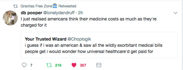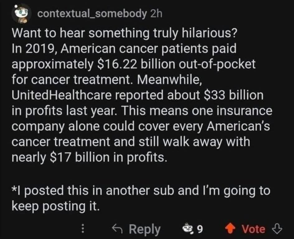 What’s interesting here is that a number of people have commented who are in political disagreement who all acknowledge that there is a healthcare problem in the US. Costs are too high. Individuals can get crushed by medical debt. The system is ripping people off and profiting from their worst moments. Something has to change. Honestly I don’t know what the answer is. But this post had some excellent thinking