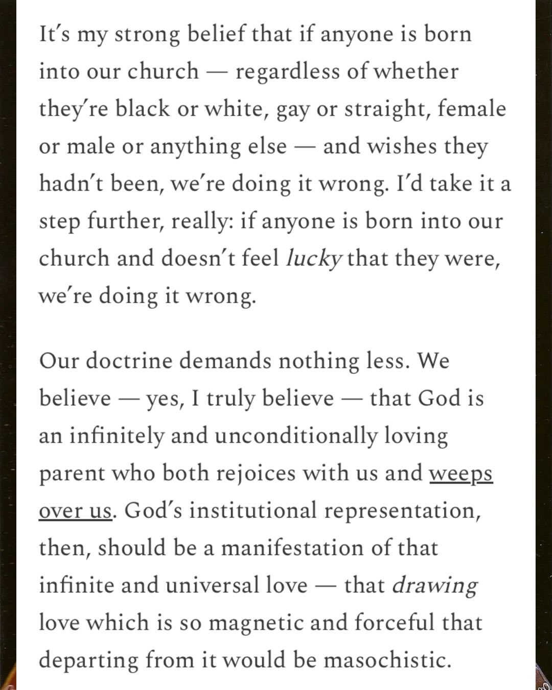 thaaaaaat being said, I agree that it’s really unacceptable that part of the vision of “maximizing potential” for Mormonism is compliance with a particular form of whiteness, heteronormativity, adherence to gender expectations, etc., It feels like a huge miss to meet people where and as they are and have a personalized vision for how they can be at their personal best, rather than just insisting that everyone mold to some sameness.