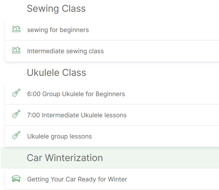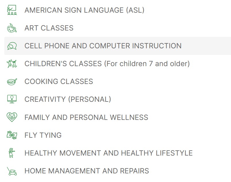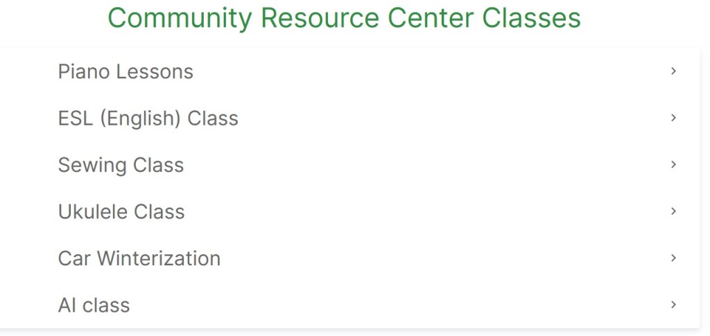 The classes vary by location. Here’s another snap so you can see the variety. I’m sure they customize class offerings based on what the volunteers can teach: